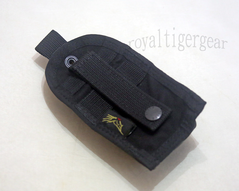 • A dummy cord loop is provided inside the pouch and an internal strip of hook Velcro lines the front of the pouch, to secure a strobe that has hook Velcro stuck to it. Two horizontal rows of webbing allow additional pouches to be attached to it. The loop Velcro square on the upper row serves to keep the top flap open, or a place to stick an IR square.